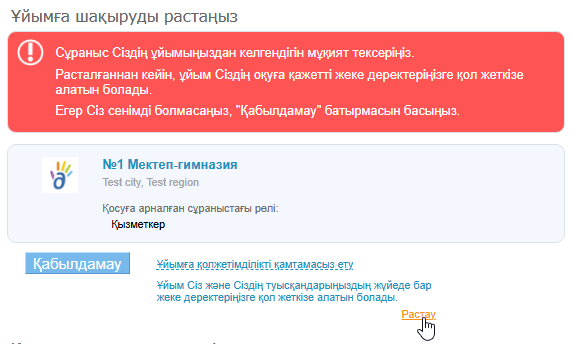 - егер сұрауды растау қажет болса, «Ұйымға қолжетімділікті қамтамасыз ету» - «Растау» батырмасын басу керек, егер білім беру ұйымы пайдаланушыға таныс болмаса, яғни сұрау қате жіберілген жағдайда, «Қабылдамау» батырмасын басу қажет.