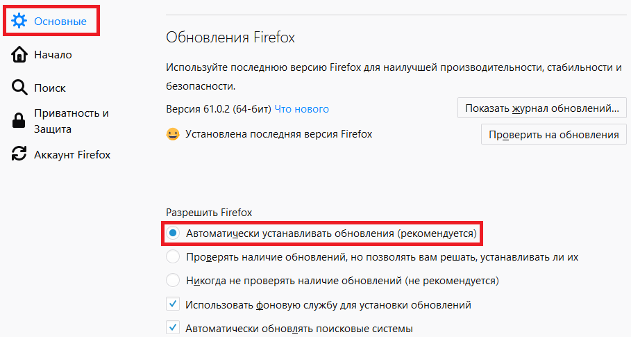 - «Обновления Firefox» блогында «Автоматически устанавливать обновления» опциясын қосу.