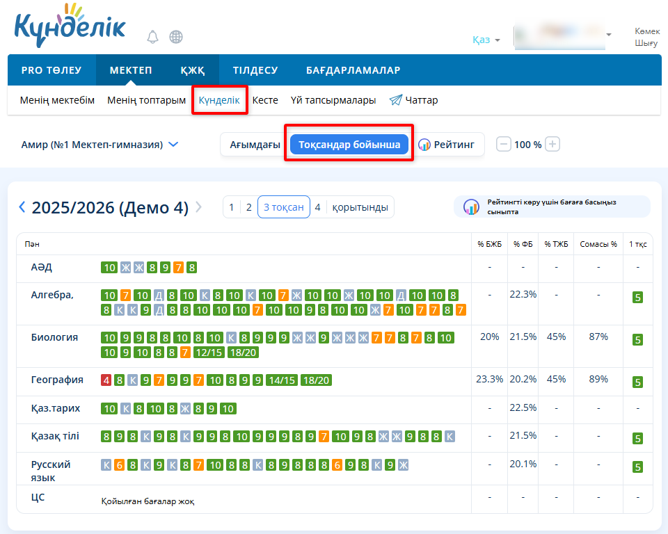 - «Күнделік» / «Пәндер бойынша» / «Тоқсандар бойынша» қойындысын таңдау.