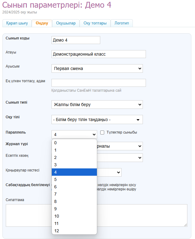 Ескерту: егер мектепте әр параллельде бір ғана сынып бар болса да, сынып баптауларында параллельді орнату қажет болады, және параллельдің нөмірі сыныптың нөмерімен сәйкес болуы тиіс (мысалы: 1-1, 2-2, 3-3 және т.б).