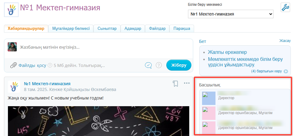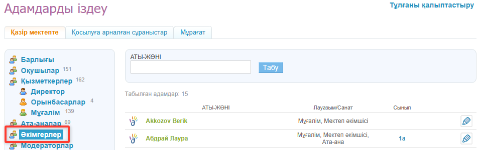 - «Адамдар» (мектеп қолданушыларының тізімін қарау мүмкіндігі);