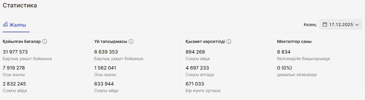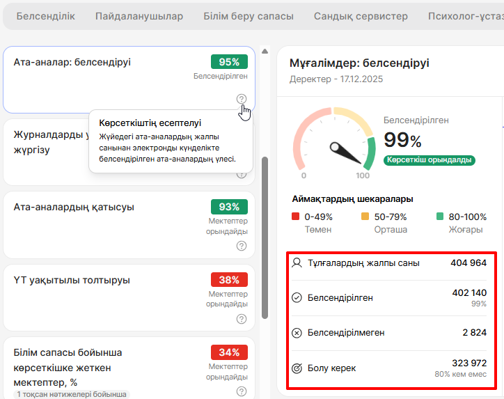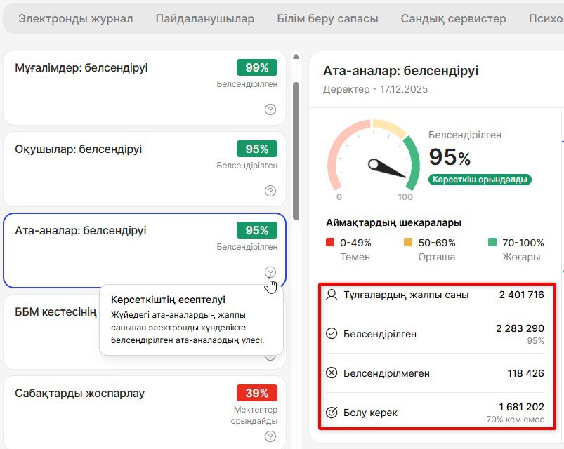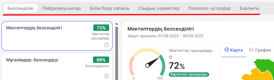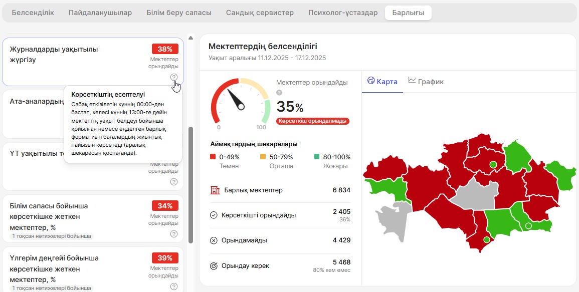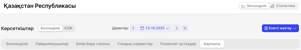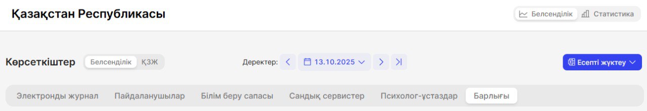 Көрсеткіштер санатын таңдаудың оң жағында демалыстағы мектептер саны көрсетіледі. Өткен апта бойынша есепті құрастыру кезеңінде мектеп кестесінде сабақтар жасалмаса, мектепте демалыс күндері өтіп жатқандығын көрсетеді.