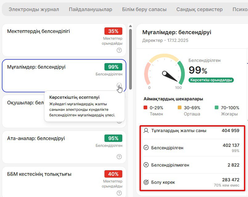 Психолог-ұстаздарды белсендіру - бұл мектепте психолог-ұстаз мәртебесі бар белсенді пайдаланушылардың %.
