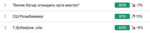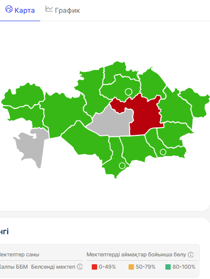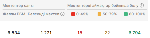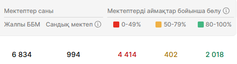 Егер индикаторды орындайтын мектептер саны индикаторды орындауы керек мектептер санынан кем болмаса, онда пайыз көк түспен көрінеді, әйтпесе қызыл түспен шығады.