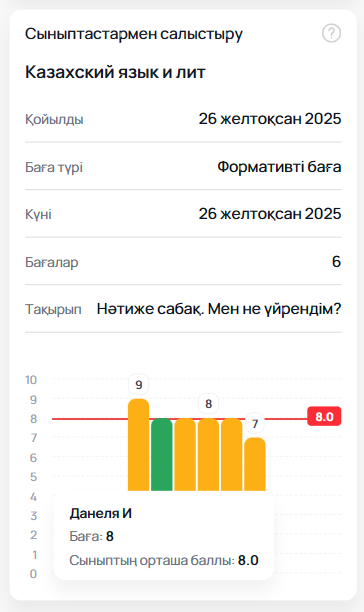 «Сыныптастармен салыстыру» қойындысы оқушының формативті бағалары мен БЖБ, ТЖБ баллдарын сынып нәтижелерімен салыстыруға мүмкіндік береді. Деректер 10 баллдық шкала негізінде диаграмма түрінде ұсынылады. Сонымен қатар пайдаланушы бағалардың қойылған күнін және сынып бойынша орташа баллын көре алады.