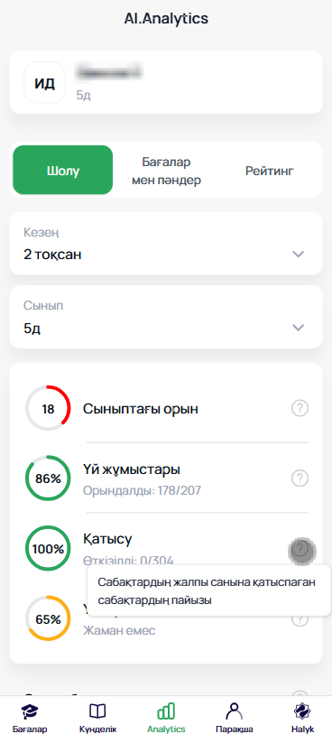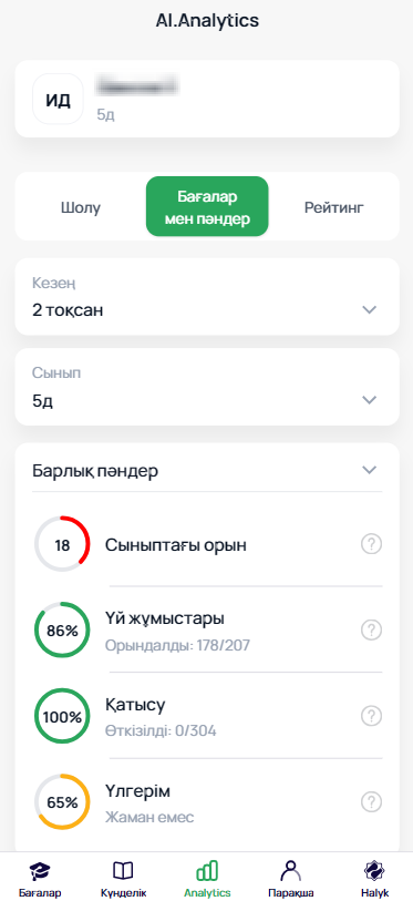 «AI.Analytics» блогы үш негізгі бөлімнен тұрады: «Шолу», «Бағалар мен пәндер» және «Рейтинг», әр бөлім оқушының білім деңгейін, үлгерім динамикасын және сыныптастары арасындағы орнын тереңірек талдауға мүмкіндік береді.