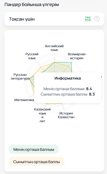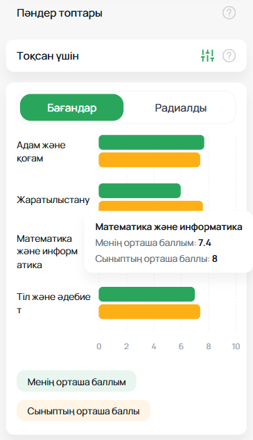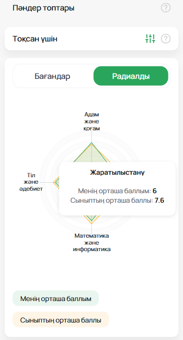 Пайдаланушы диаграмманың бағанды немесе радиалды түрін таңдай алады, сондай-ақ әр пәнді жеке қарап, өз көрсеткіштерін сыныптастарымен салыстыруға мүмкіндігі бар.