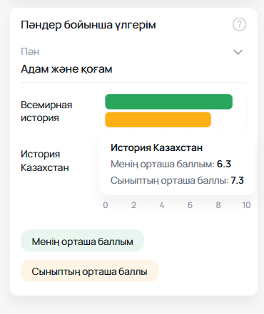 «Пәндер бойынша үлгерім» қойындысы оқушыға өз біліміндегі мықты жақтарын және назар аударуды қажет ететін тұстарын анықтауға мүмкіндік береді. Сонымен қатар нәтижелерді параллель сыныптармен салыстыруға болады.