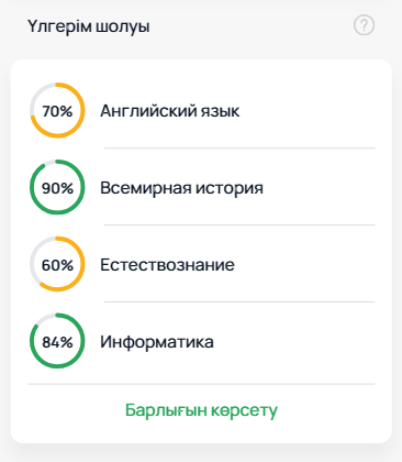 «Үлгерім шолуы» қойындысы оқу барысындағы прогрессті пайызбен көрсетеді. Келесі мәліметтер қолжетімді: барлық пәндер бойынша немесе әр пәнді жеке қарауға болады.