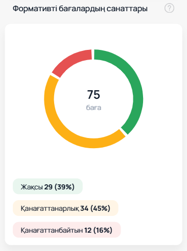 «Формативті бағалардың санаттары» атты шеңберлі диаграмма тоқсан ішіндегі бағалардың үлестірімін және оқушының жалпы үлгерім деңгейін көрсетеді. Диаграмманы басу арқылы қосымша белгілі бір топтағы оқушылар саны мен олардың пайыздық үлгерімін, сондай-ақ қаралып отырған баланың қай топқа жататынын білуге болады.
