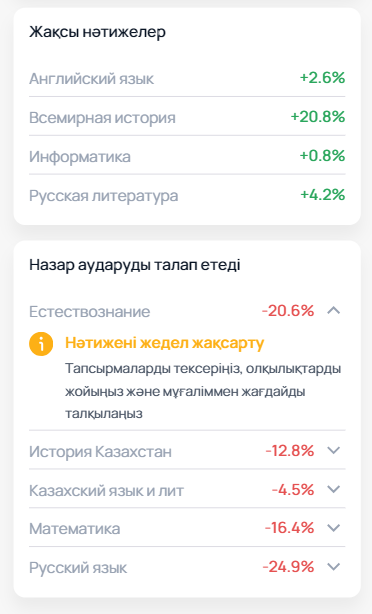 Қажетті пән бойынша төмен көрсеткіштерді жақсарту және оларды жақсы нәтижелерге жеткізу бойынша ұсыныстарды қарауға болады.