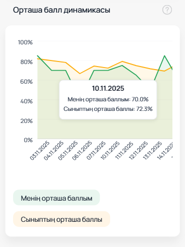 «Орташа балл динамикасы» қойындысы орташа баллдың күн, апта, ай немесе оқу кезеңі бойынша өзгерісін бақылауға және оны өз сыныбындағы оқушылармен салыстыруға болады.