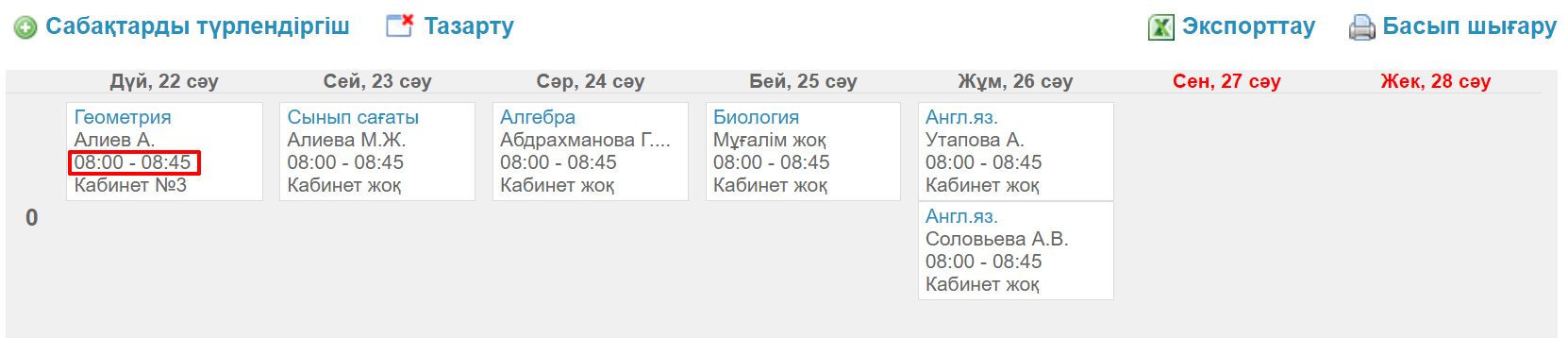 Сабақ кестесінде сабақ пен қоңырау уақыты қалай көрсетіледі?
