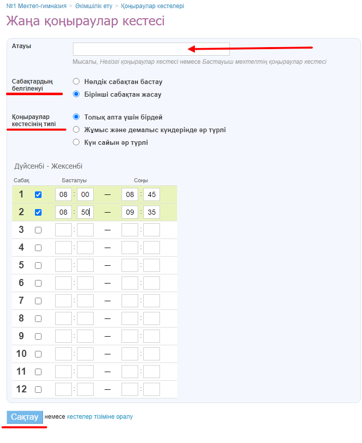 - сабақтың басталу және аяқталу уақытын белгілеу - қоңырау уақытын көрсетер кезде, міндетті түрде сабақ ретінің жанына құсбелгісін қою қажет. Егерде, құс белгі қойылмаса, сабақтың басталған және аяқталған уақыты кестеде көрінбейді;