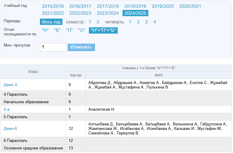Примечание: по умолчанию минимальное число пропусков, отображаемое в отчёте = 1. Возможность редактирования этого минимального числа предоставлена администраторам и редакторам.