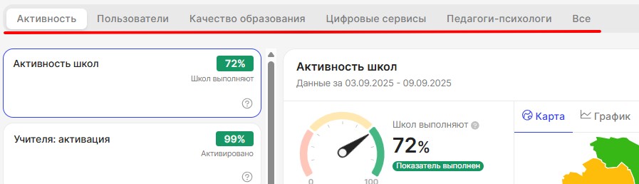 - Активность школ. Категории активности - отображает количество школ в разных категориях активности (низкая, средняя, высокая) по выбранному показателю.