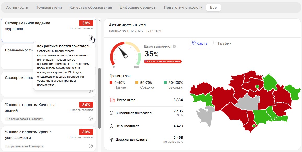 Мониторинг активности работы в системе Kundelik.kz наглядно отражает качество ведения электронного журнала образовательными организациями.