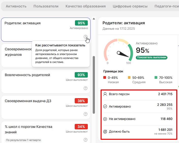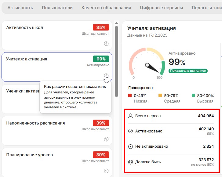 - Активировано - количество учителей, которые авторизованы в системе.