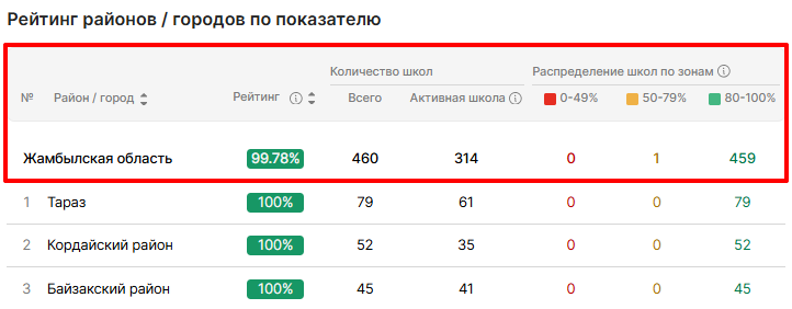 - Рейтинг города/района, % - доля ОО в городе/районе, достигающих установленных значений по показателю. Рассчитывается по формуле: