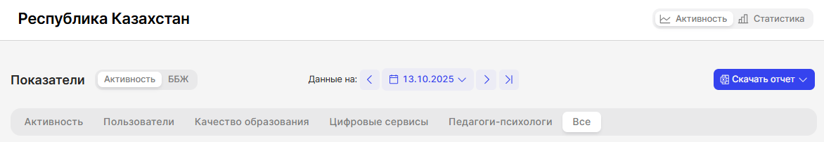 В верхней части экрана располагается блок с информацией об отчетном периоде, о области/районе/городе и блоки с показателями активности.