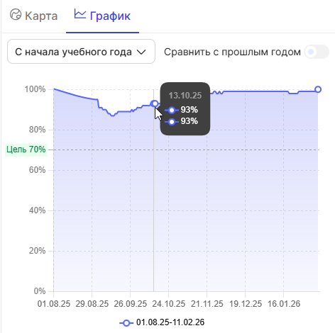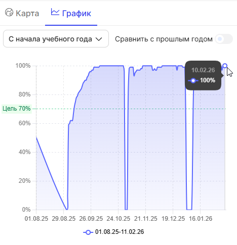 Справа от даты, отображается количество школ, находящихся на каникулах. Каникулы в школе учитываются в том случае, если за прошедший отчетный период в расписании школы не было создано ни одного урока.