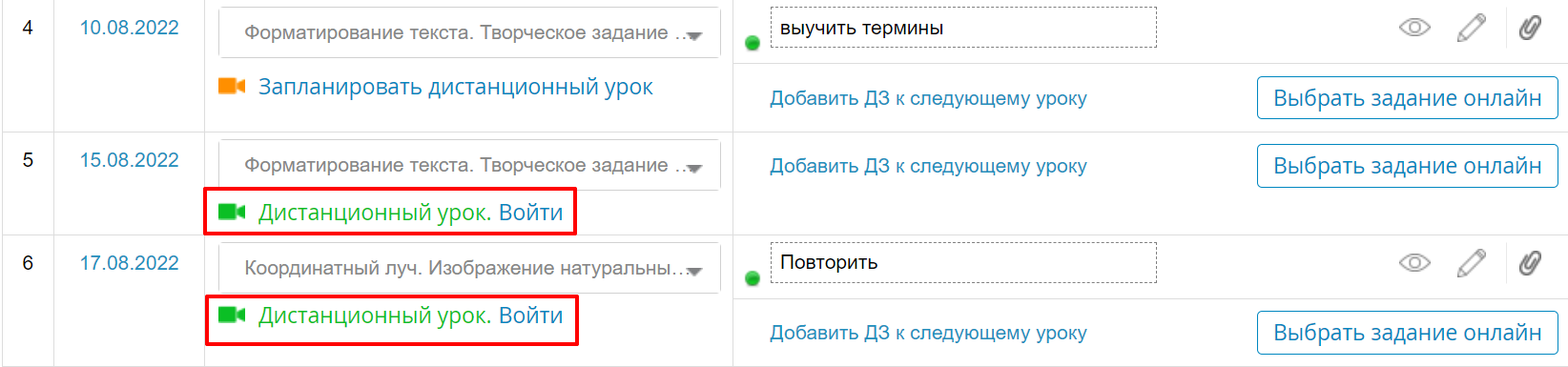 - нажмите на ссылку «Запланировать онлайн видеоурок» напротив урока, для которого хотите создать конференцию;