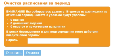 Удаление расписания предполагает удаление всех данных, связанных с уроками: общей информации о них, оценок, отметок о присутствии, домашних заданий и комментариев.