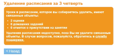 Внимание! при удалении расписания через сотрудников Службы поддержки вся связанная с данным расписанием информация (уроки, оценки, отметки, темы уроков и домашние задания) удаляется из Системы безвозвратно. Вся ответственность за последствия, приводящие к удалению информации, связанную с данным расписанием, ложиться на сотрудников Образовательной организации.