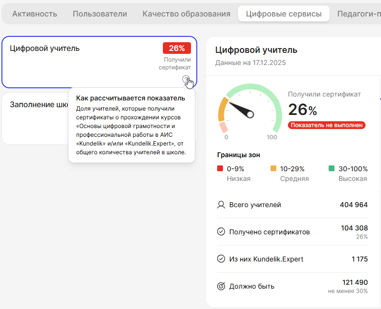 Показатель «Цифровой учитель» отражает успешное прохождение курса «Основы цифровой грамотности и профессиональной работы в АИС «Күнделік» для учителей общеобразовательных школ Казахстана» и онлайн-курс для администраторов «Kundelik.Expert».