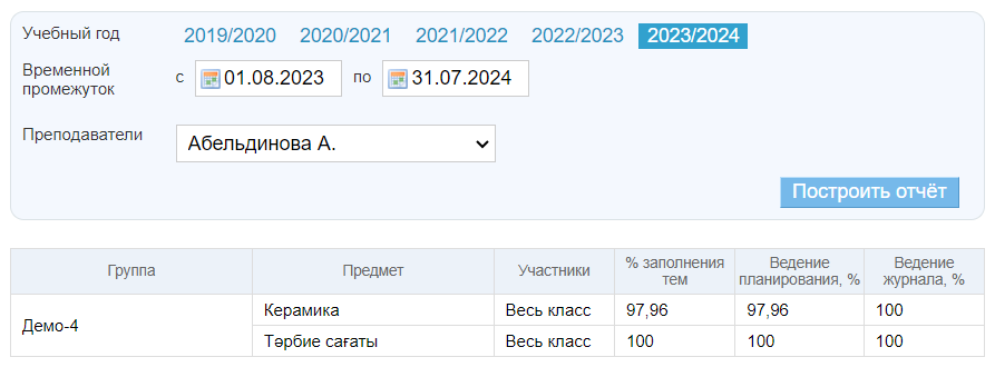 Отчёт позволяет отслеживать и анализировать ведение журнала предмета и тематического планирования определенного сотрудника за конкретный временной промежуток.